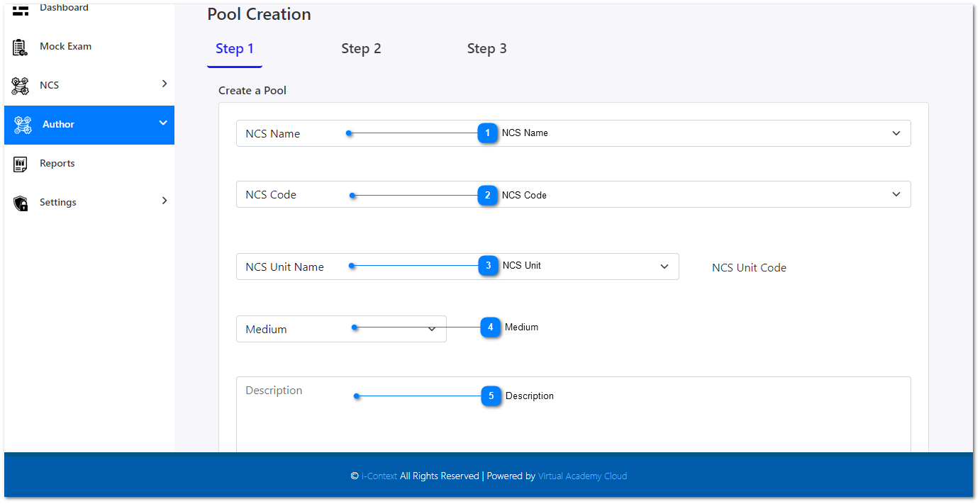 1. From the given drop-down, you need to select the NCS Name that you are going to create the question pool for.