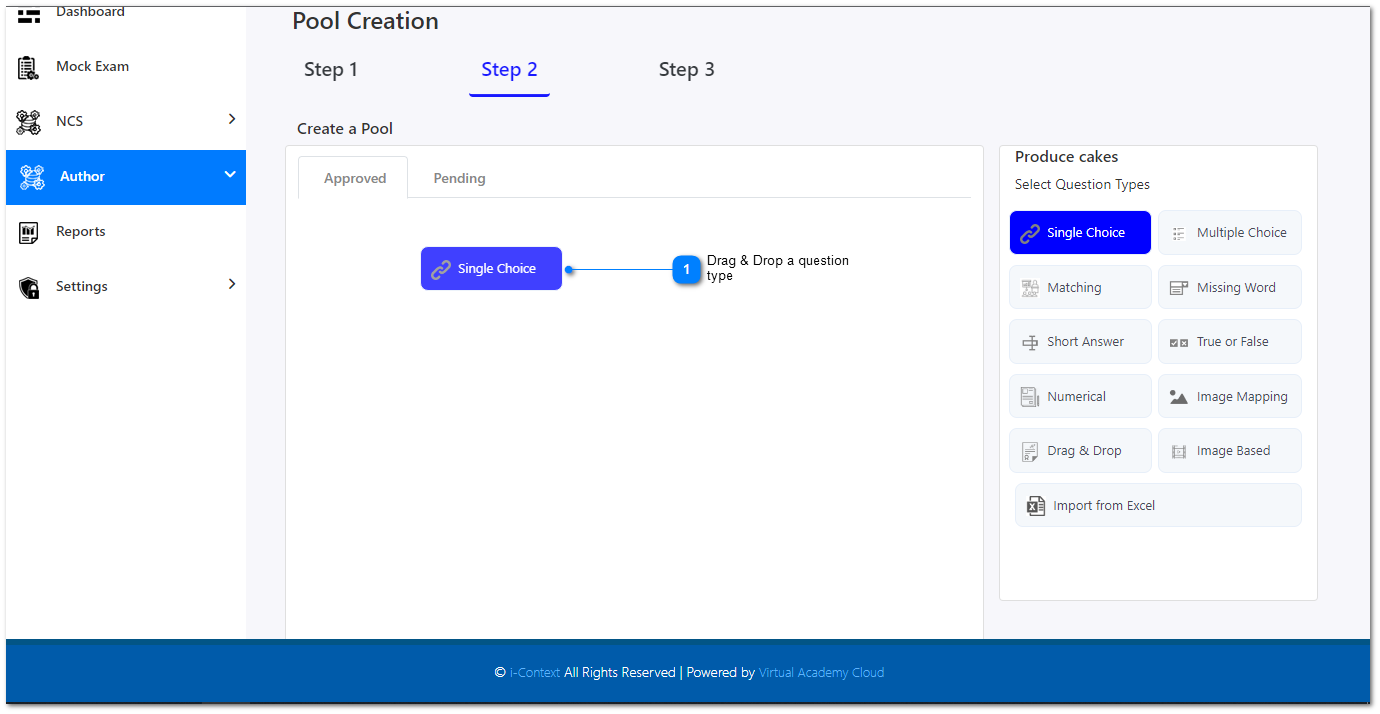 1. From the right side question types, select a relevant question type and drag & drop that into the approved or pending section.