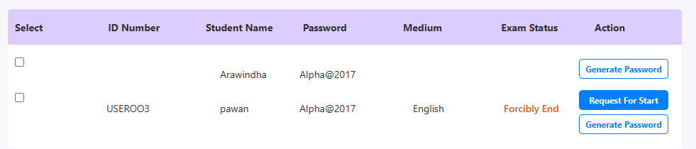 - Generate Password - Generating a new password for a selected student to login.