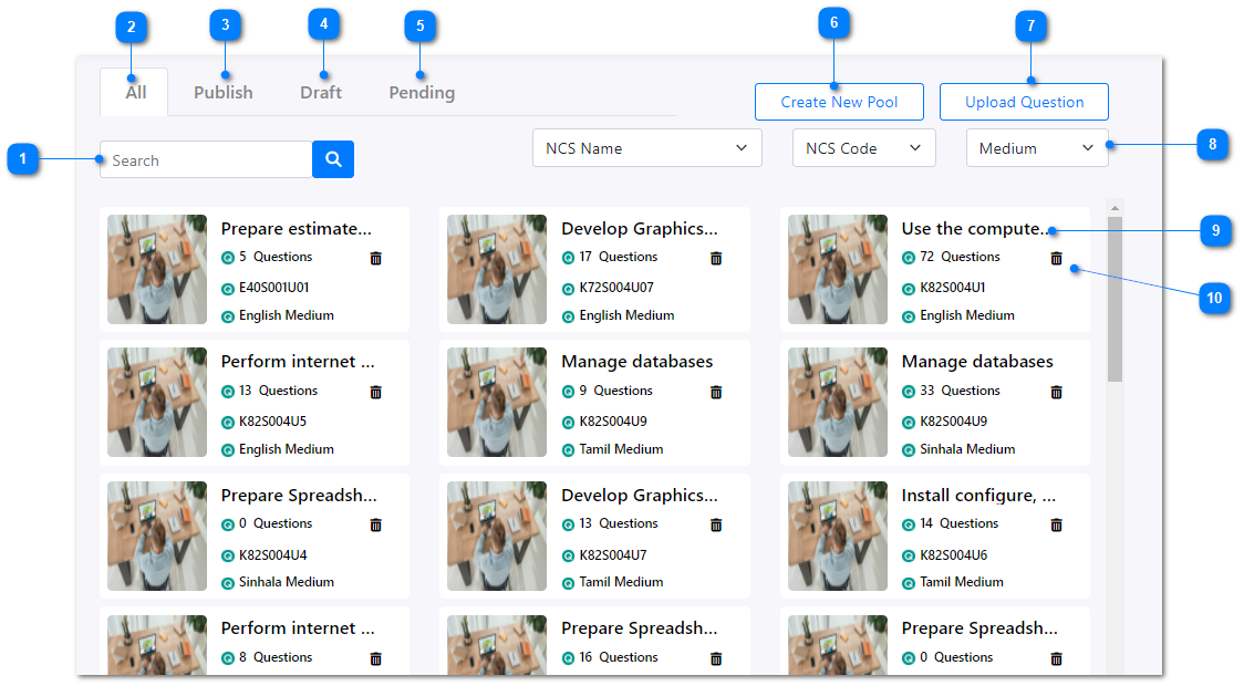 - You can filter the question pools list based on NCS name, NCS code, and medium.