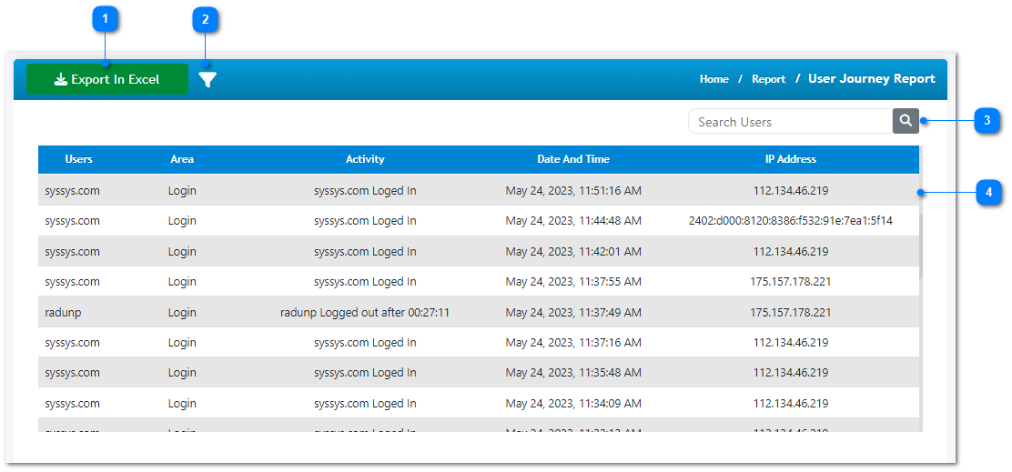 - Filter the details shown in the table below by activity area, user role, user group, or activated time duration etc.