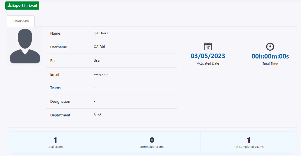 Then in the blue color section, the total number of exams that this user was assigned and how many of them were completed or not is mentioned.