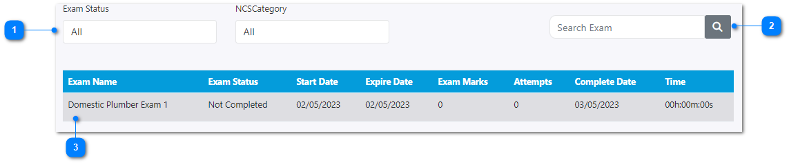 Exam details table can be filter based on the exam status (completed or not completed) and NCS category.