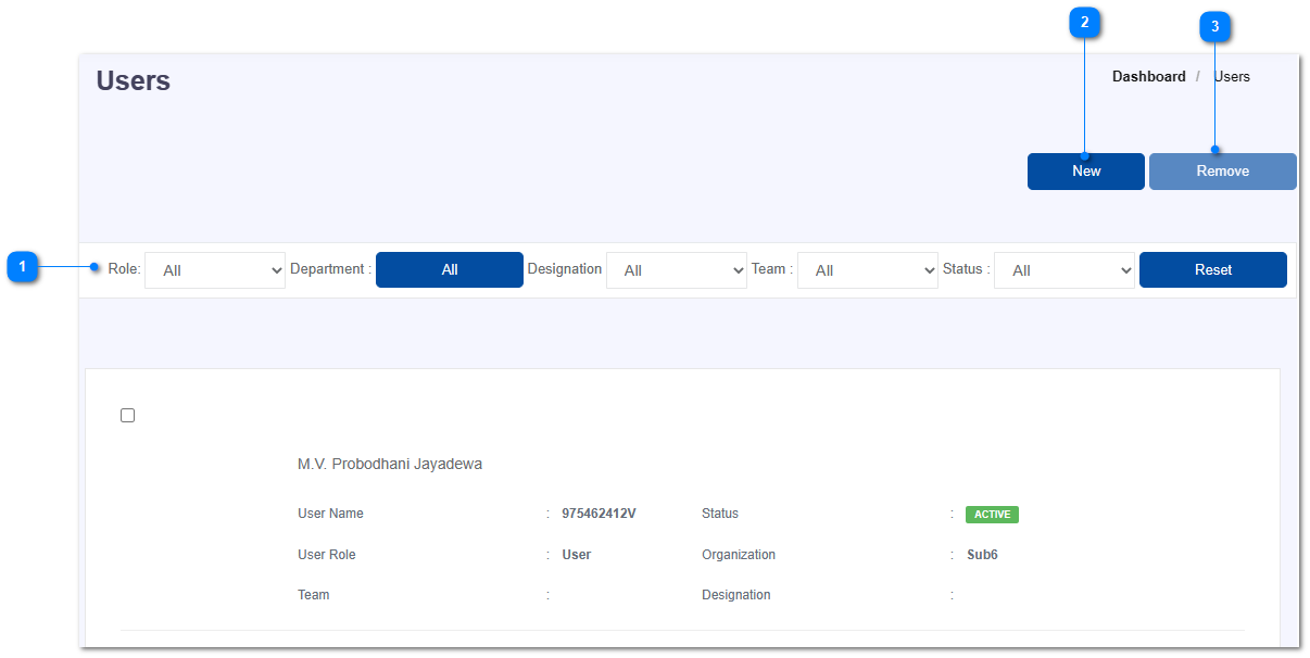 - Filter the users list down below based on user role, department, designation, team, or user status (active, inactive, or delete)